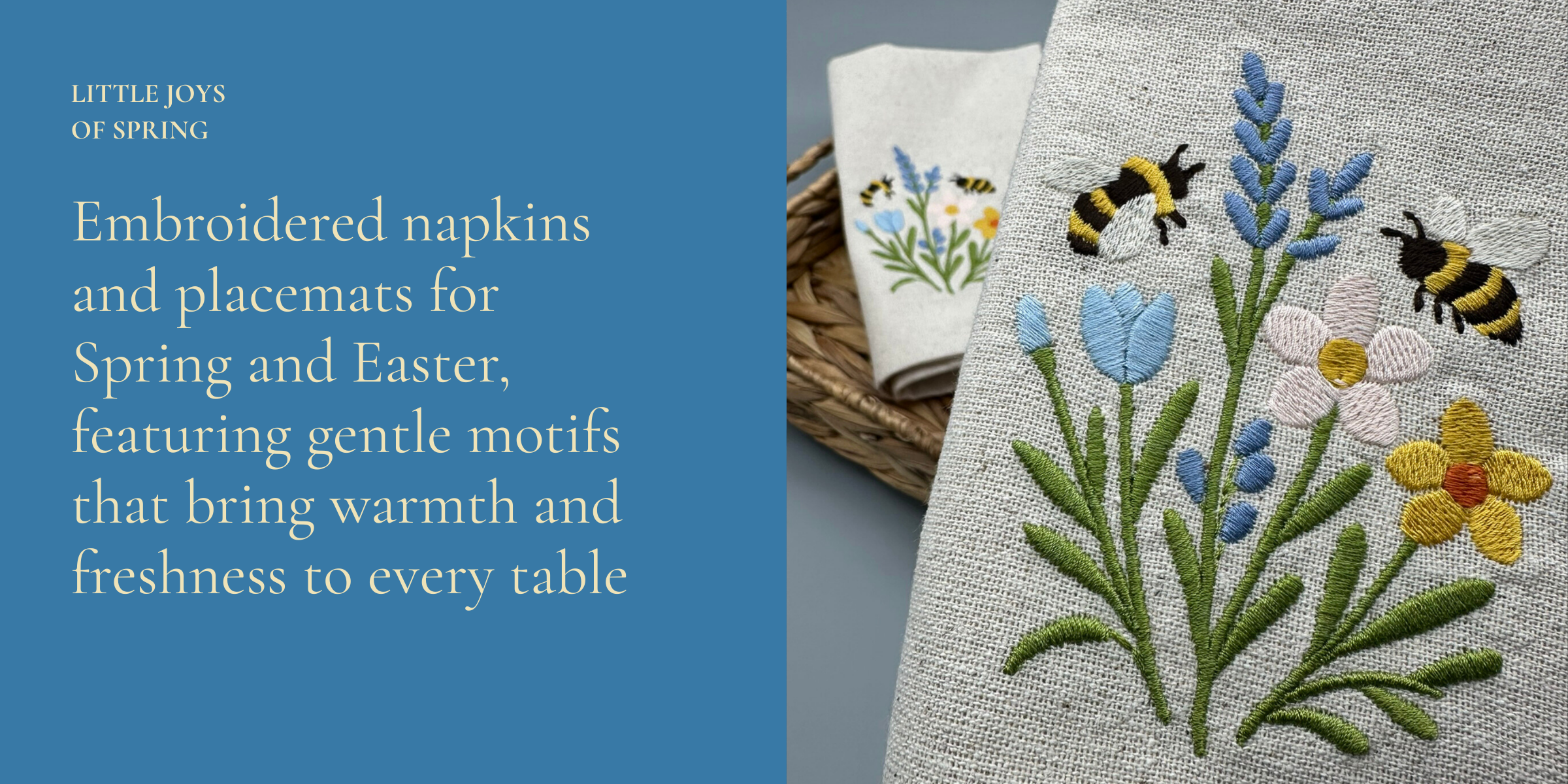 Embroidered napkins and placemats for Spring and Easter, featuring gentle motifs that bring warmth and freshness to every table