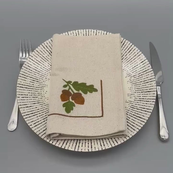 A delicate branch and acorn motif is embroidered neatly in the corner, allowing the design to remain visible once plates and cutlery are set. The understated placement gives these napkins a refined look that works beautifully beyond the autumn season—equally suited to casual weekday meals, relaxed gatherings, and thoughtfully styled tables year-round.