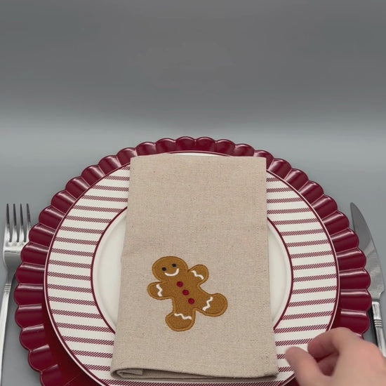 The Gingerbread embroidered cloth napkins bring a playful, handcrafted detail to festive tables. Featuring a smiling gingerbread motif stitched neatly in the corner, the embroidery stays visible when folded or layered under flatware.