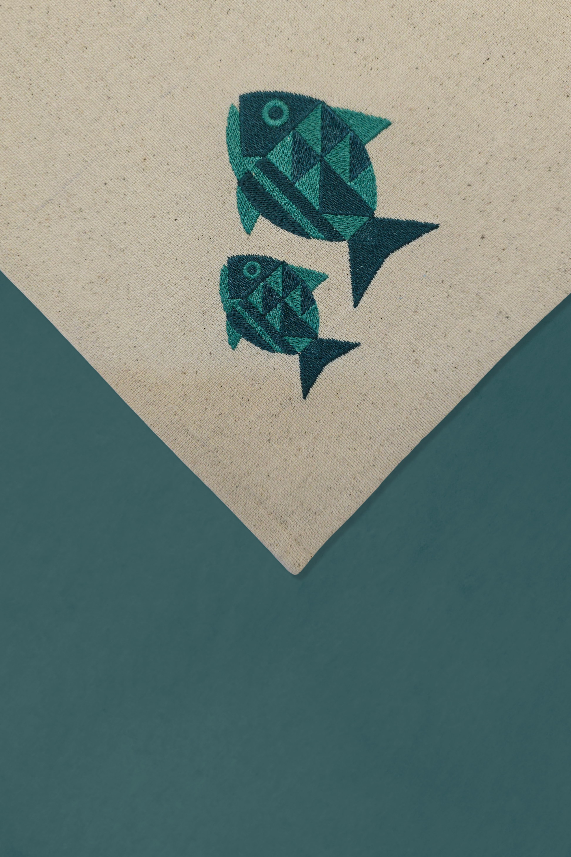 Complete the look with the Marine Mosaic table runner, which places matching fish and stitched triangle embroidery along the overhangs so the artwork stays visible while the center remains clear for easy layering with plates and centerpieces.