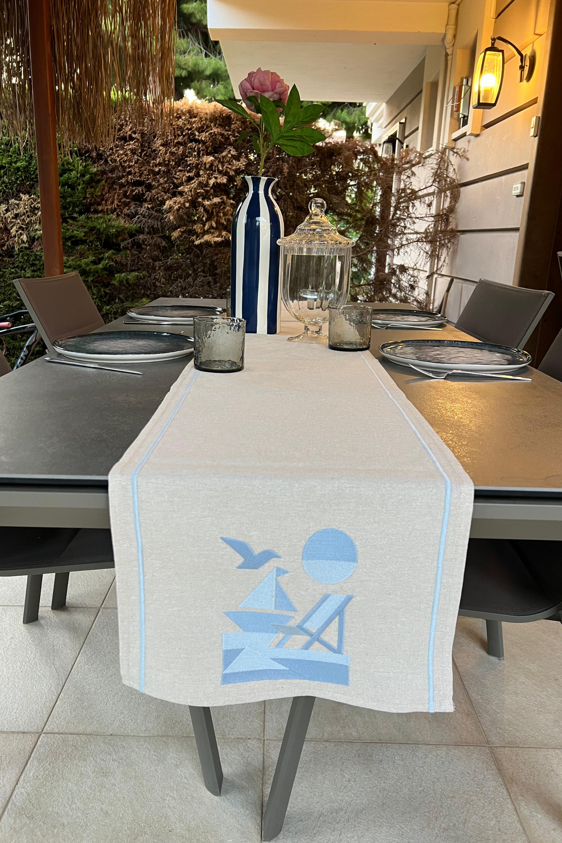 Summer Geometry Linen-Look Napkins and Runner – Sailboat Coastal Decor