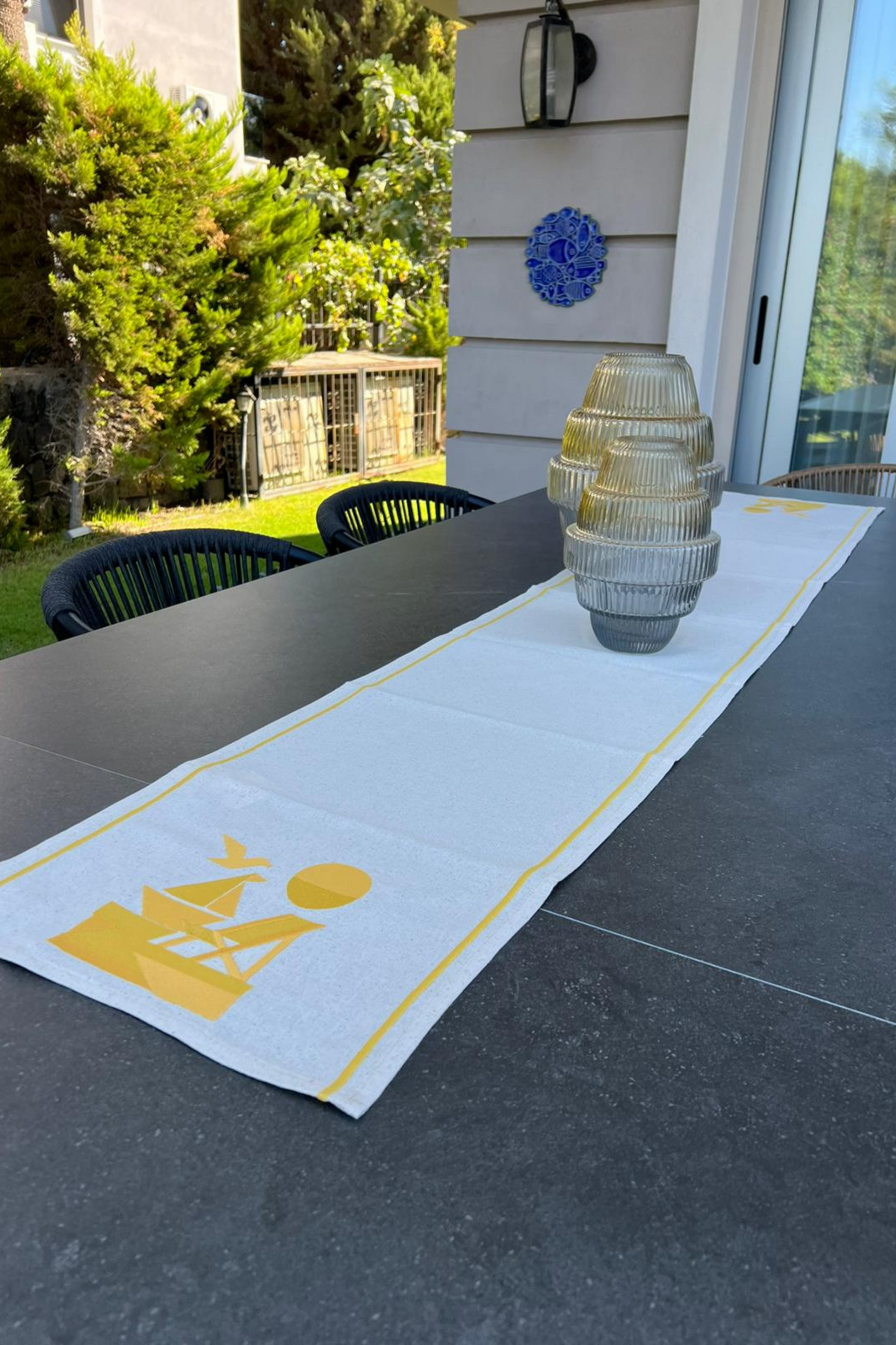 The runner includes embroidery placed along the overhangs so the design stays visible when the table is set. Each runner is finished with embroidered piping in the same color as the fabric for a clean, coordinated look.