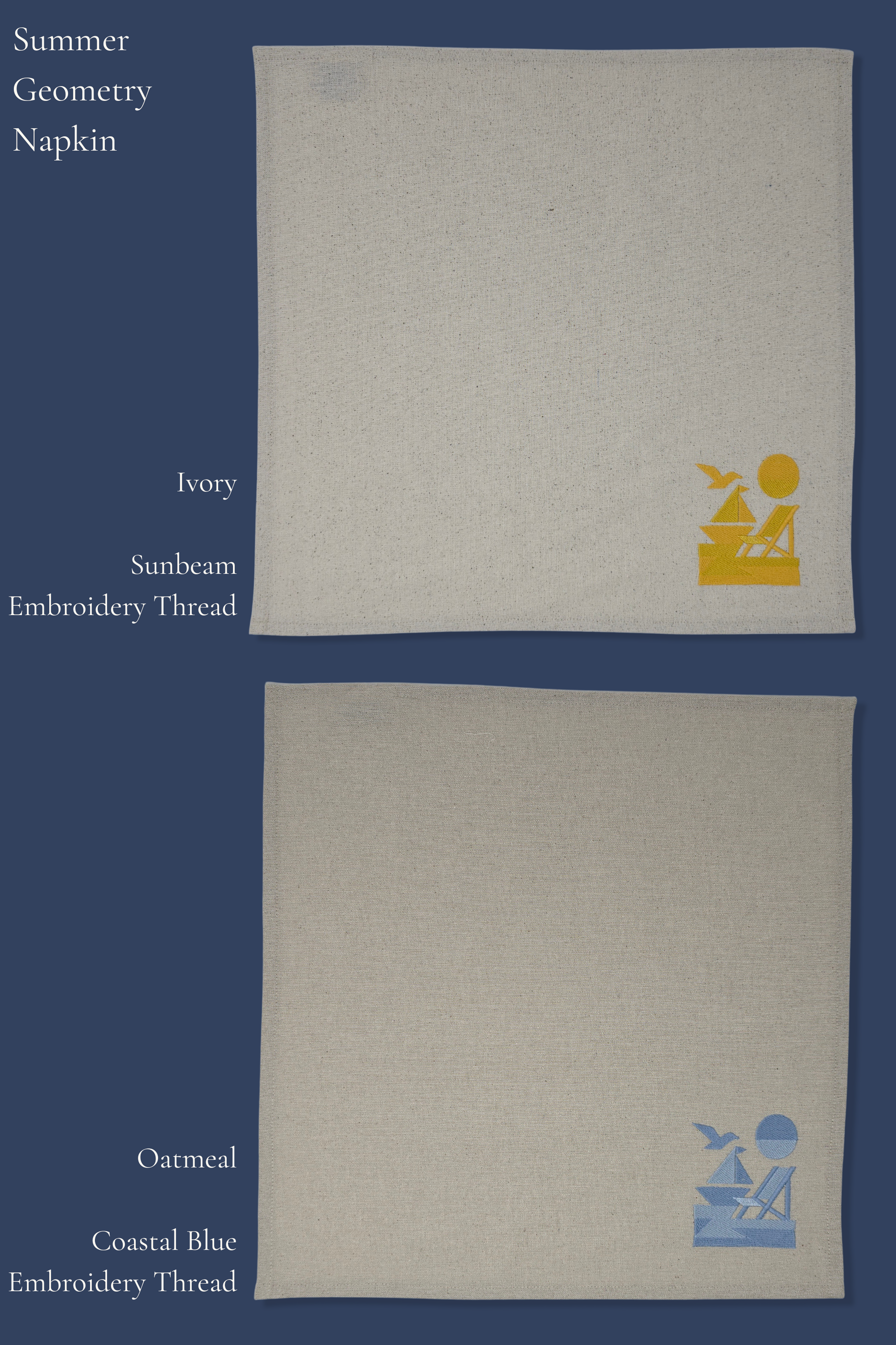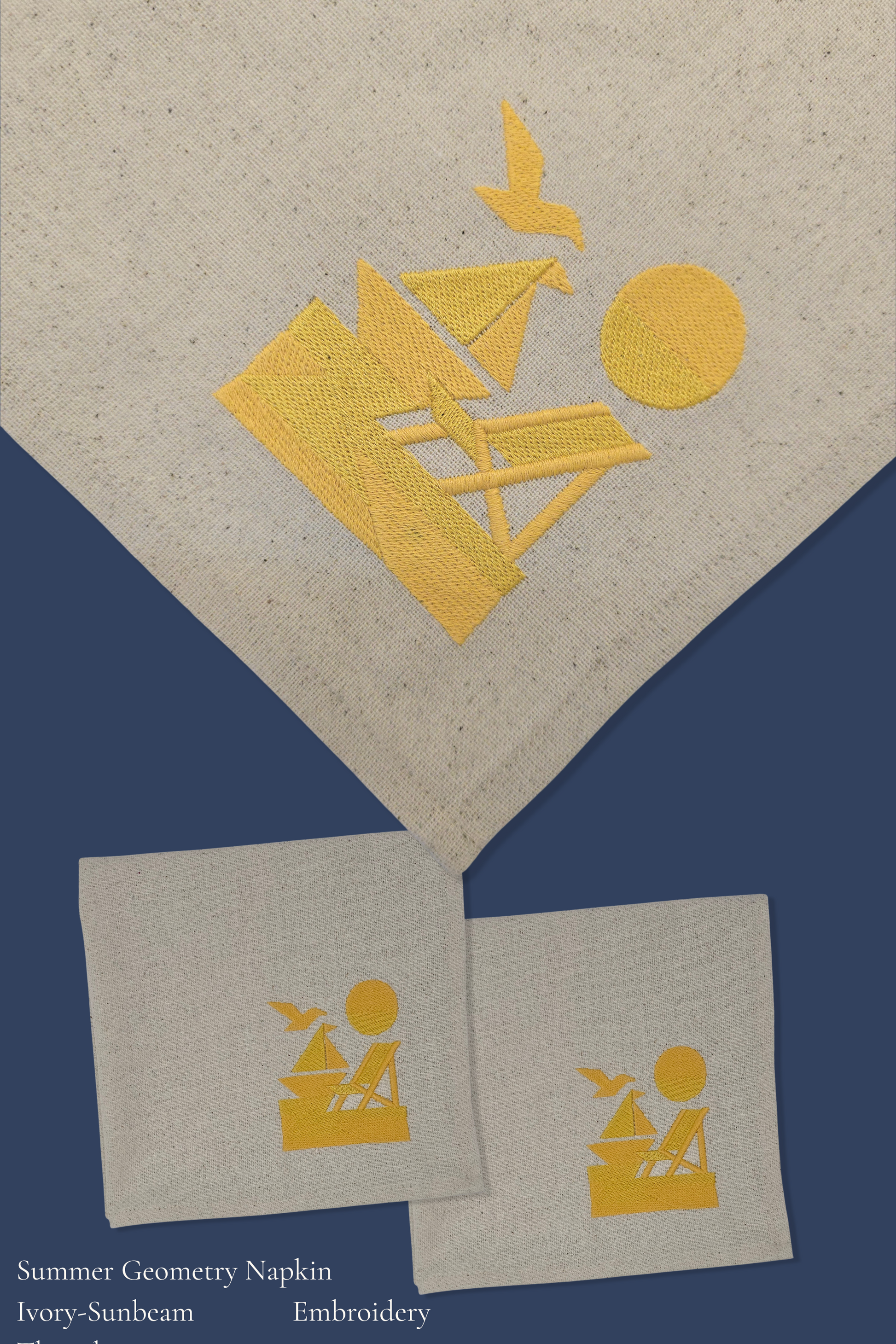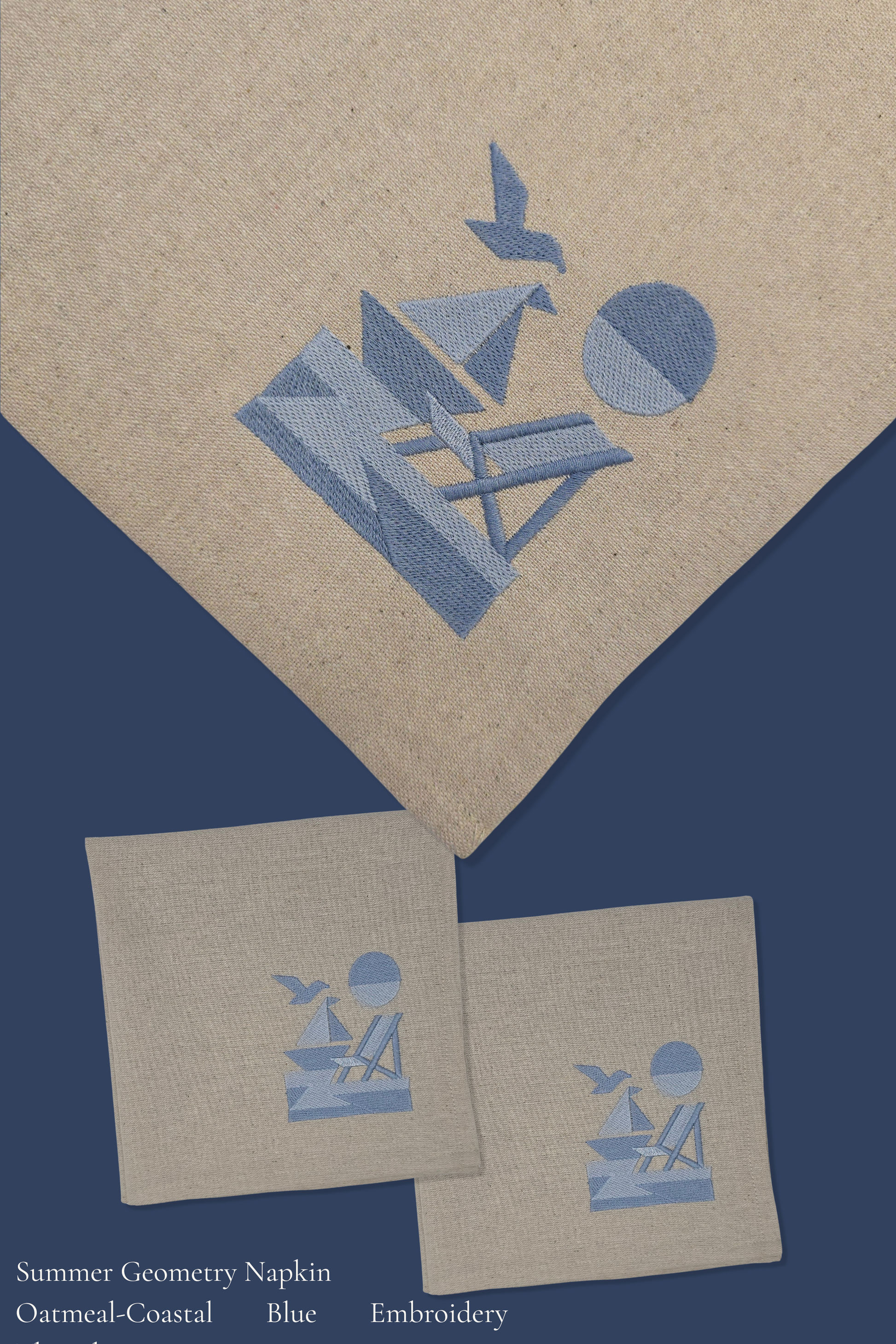 Summer Geometry is designed for long days when the table moves outdoors and meals last a little longer. Clean geometric embroidery captures sailboats, suns, and seagulls, bringing a fresh perspective to any setting.