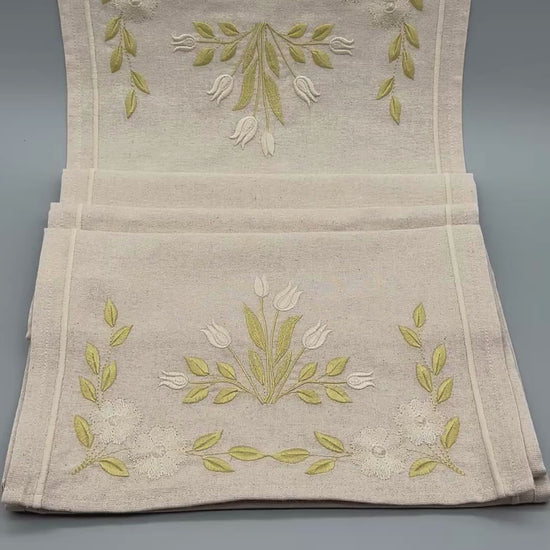 The Bloom Runner completes the table with soft cream and sage green embroidery placed along the overhangs so the design stays visible when the table is set. Each runner is finished with embroidered piping in soft cream color for a clean, coordinated look.