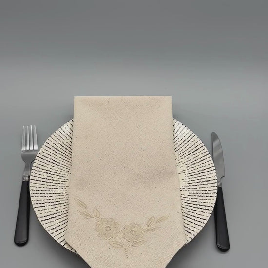 Each napkin features a delicate corner cluster of daisies, embroidered in soft cream thread on an Ivory base for a refined, tone-on-tone look. The corner placement keeps the embroidery visible beside plates and cutlery, adding gentle character without overwhelming the place setting.