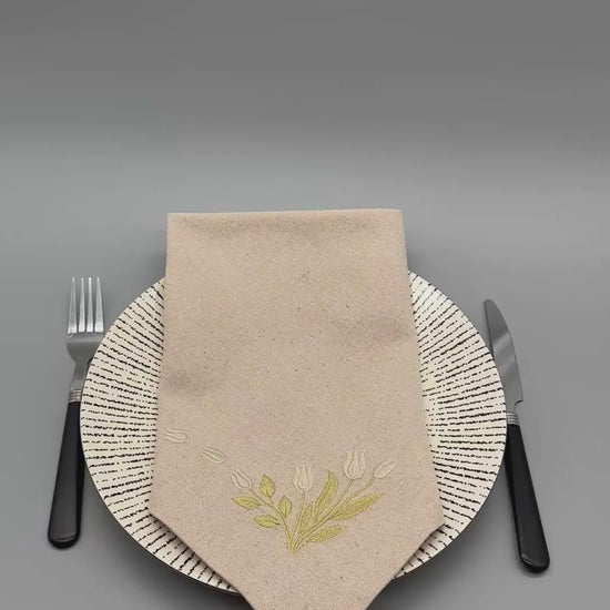 Each napkin features a corner bouquet of tulip buds embroidered in soft cream with sage green stems and leaves on an Oatmeal base. The embroidery creates a calm, refined look that blends effortlessly into a wide range of table settings. The corner placement ensures the motif remains visible beside plates and cutlery, adding subtle character without overpowering the place setting.